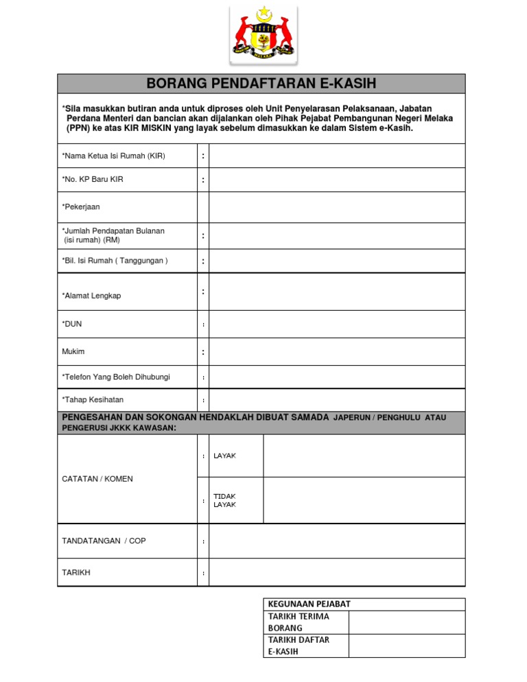 Sila layari atau klik borang Pendaftaran Borang E Kasih Online Jika borang online tidak disediakan anda boleh ke Pejabat Kebajikan Masysrakat terdekat dan anda boleh mengisi borang disana Semakan Bantuan E-Kasih Online Malaysia. Mencarum sekurang-kurangnya RM5 sebulan atau RM60 setahun ke dalam akaun KWSP.